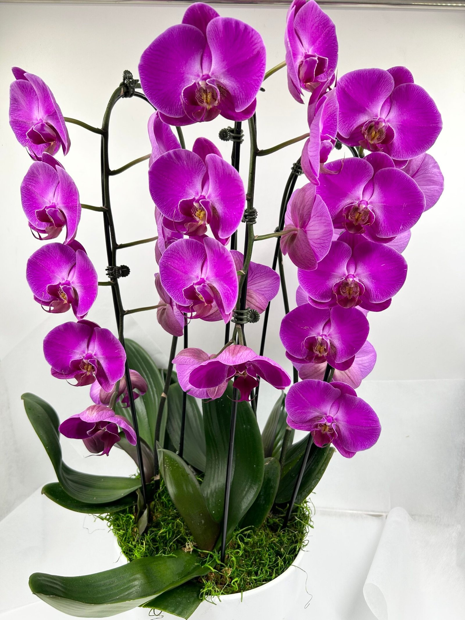 This Purple Three Stem Cascade Orchid features beautifully arranged petals in a sleek and modern design.